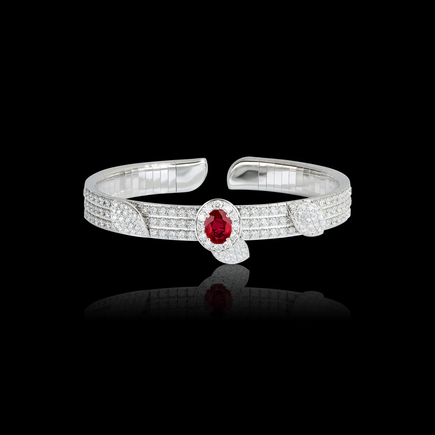 The red of the ruby, sourced from Mozambique, one of the most precious gemstone deposits, is a symbol of vitality, passion, and tenacity, while also being one of the most ethically secure sources.