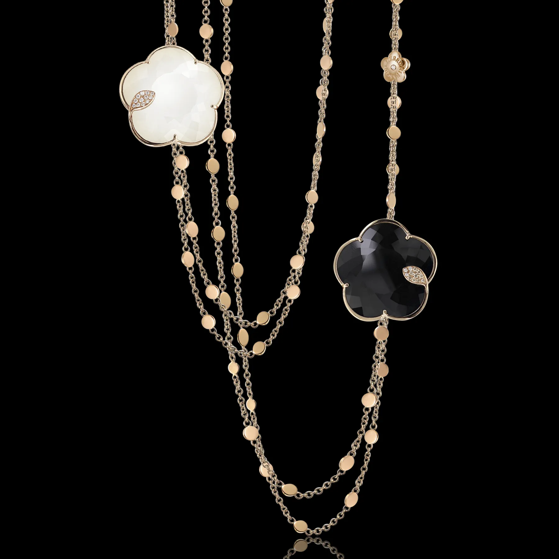 In the black and white there is the embrace between day and night, two flowers intertwining, two adjoining gems, chasing lights. The line combines the elegance and energy of onyx and the silk-like glow of the white agate marrying with the lunar iridescence of the mother of pearl.
