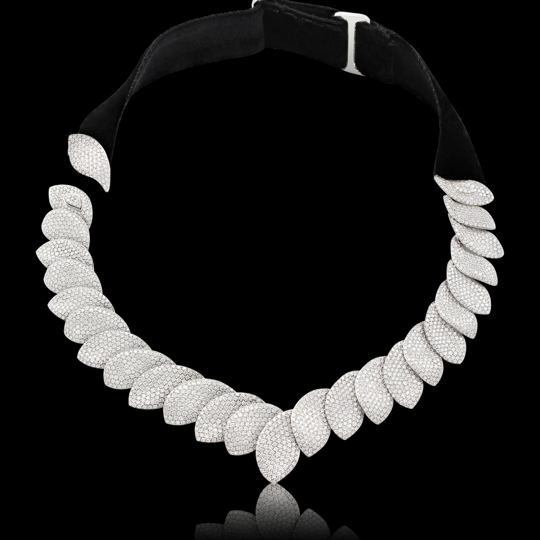 The adjustable black velvet bracelet can be connected to the front part of the necklace to create a choker, or a collier with the bracelet. The front part when united with two bracelets can create a long, luxurious necklace.