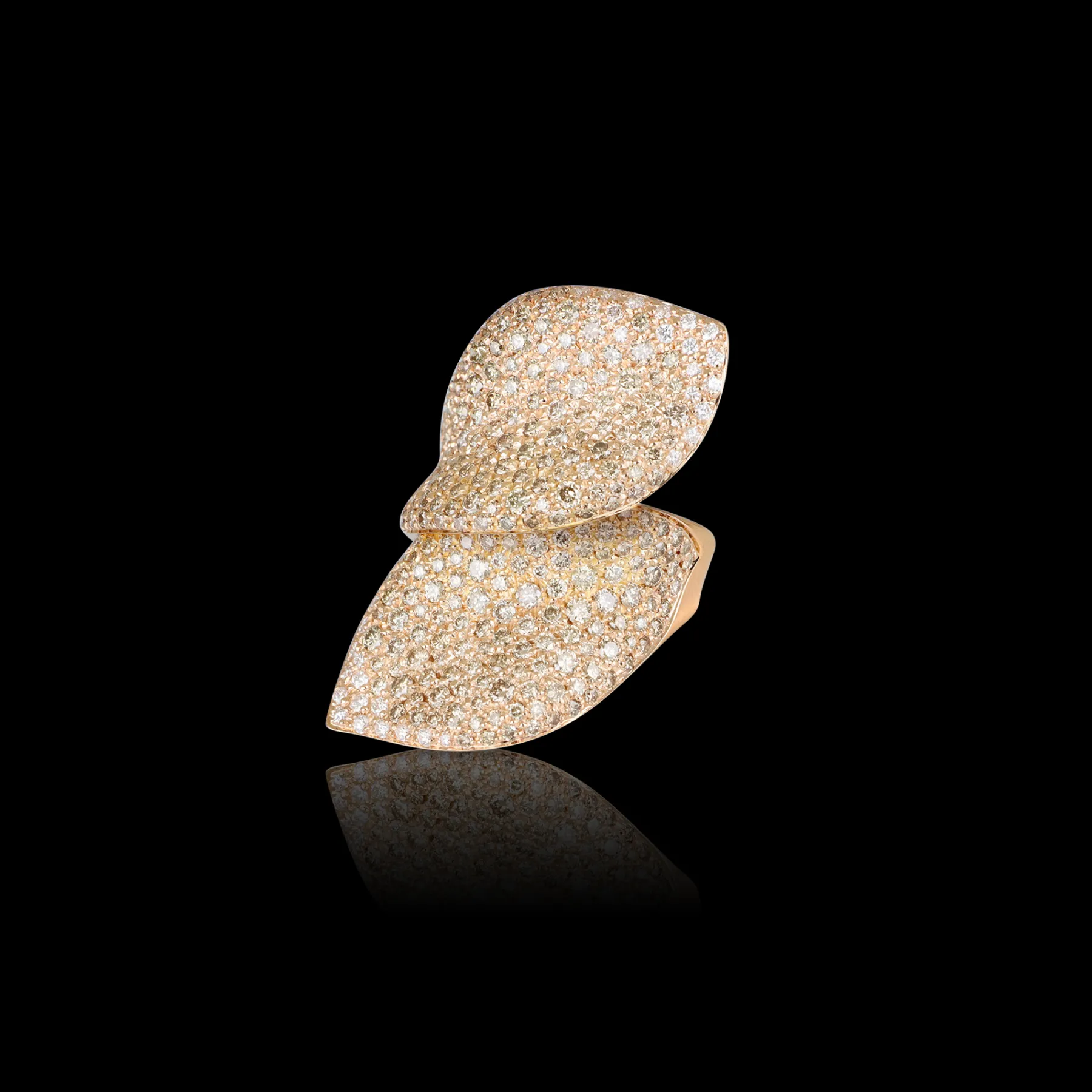 Artistic work on the pavé enables the light of the diamonds to emanate beyond the edges of the jewel, giving the form infinite movement.