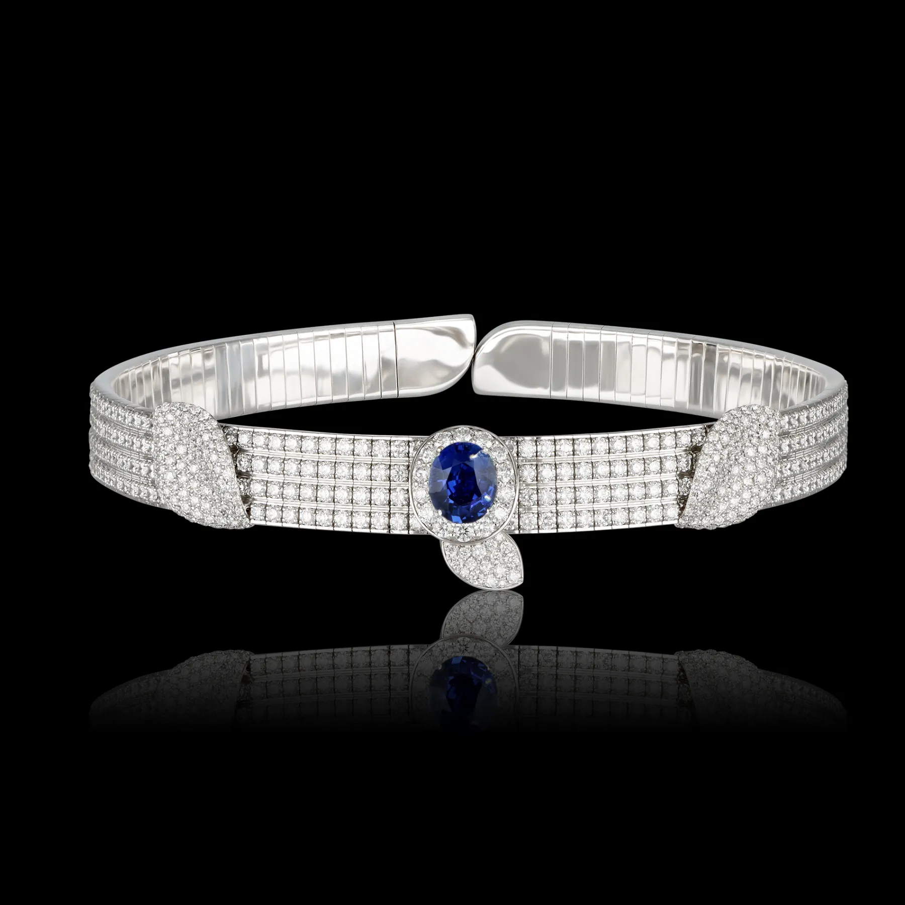 The intense Royal blue of sapphire, from responsible mines in Madagascar or Sri Lanka, represents the essence of truth, faith in love, and the color of infinity, like the sky and the sea.