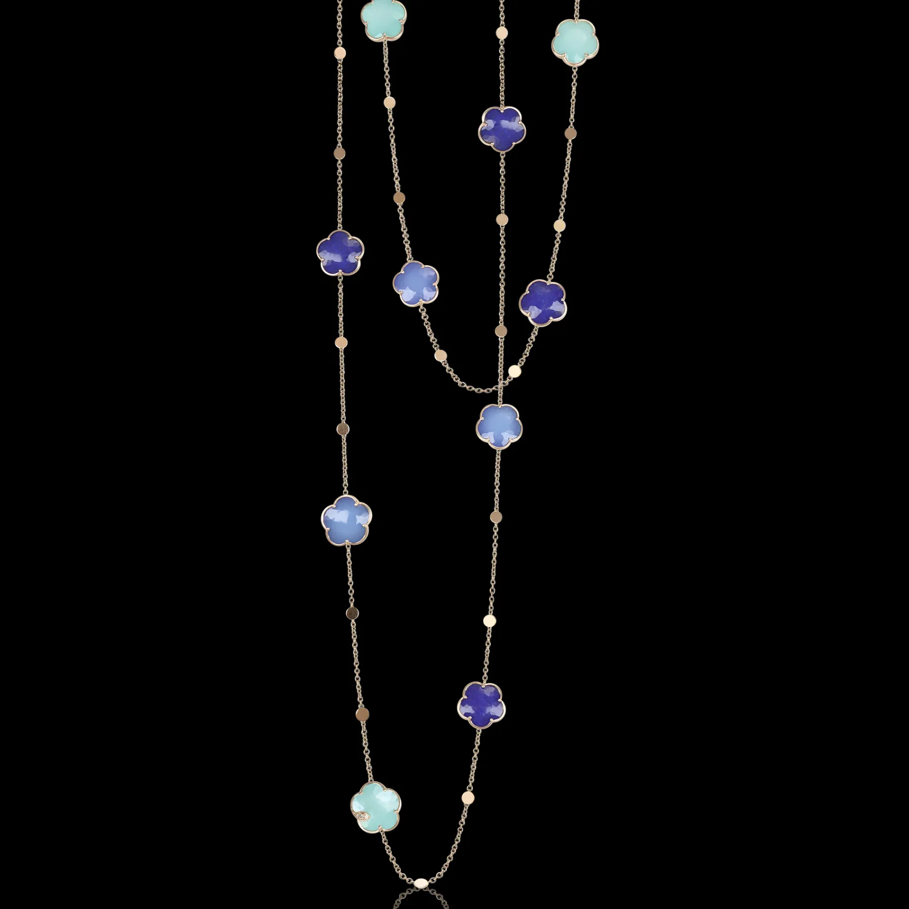 Sea Moon is the marriage of turquoise and moonstone. The turquoise is a great protective stone and it is the symbol of the journey, something that leads you to see the world, the infinite, to want to go beyond where we are. The moonstone is also an expression of absolute protection, the stone protects the feminine sphere, its most hidden part, and in fact it goes right to the core to bring this mysterious light outside, to free it.