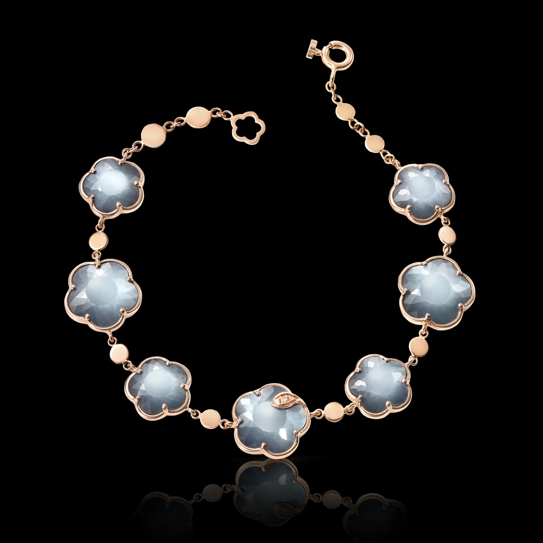 Ton Joli maintains the delicate faceting of the taglio Bon Ton, an exclusive Pasquale Bruni patented cut. The collection reinterprets the five-petals iconic flower of the Maison in new sophisticated proportions. Gems blend into a rose gold flower, wrapped in a leaf of white and champagne diamonds.